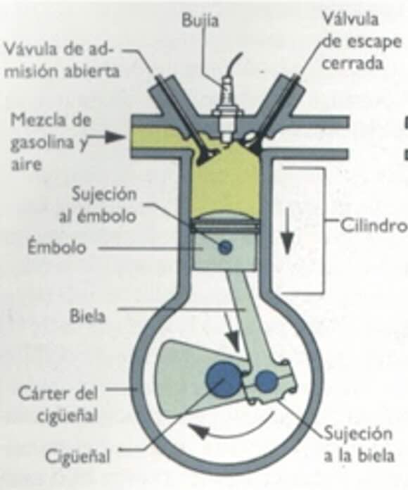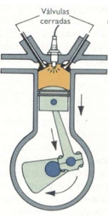 - Movimiento: El pistón es empujado hacia abajo por la expansión de los gases calientes generados durante la combustión.