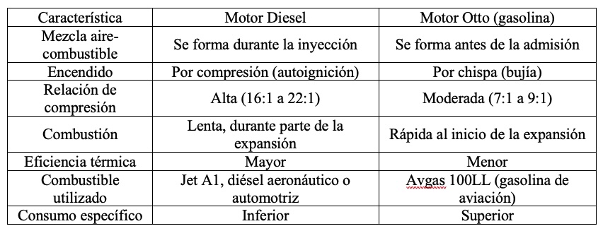 Los motores diésel operan bajo el ciclo de combustión por compresión (ciclo Diesel). No requieren bujías, ya que la mezcla se enciende por la alta temperatura alcanzada durante la compresión del aire. Esto les permite ofrecer un consumo específico de combustible más bajo y mayor autonomía. Además, la mayor densidad energética del Jet-A1 les permite extender el alcance con menor volumen de combustible.