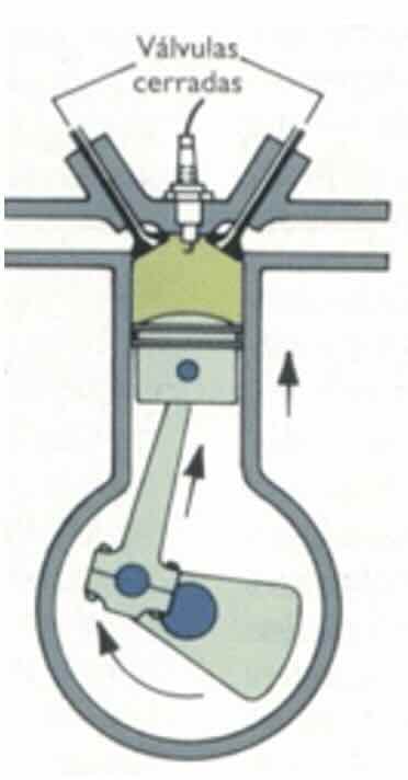- Movimiento: El pistón comprime la mezcla carburada dentro del cilindro.
