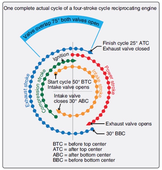 En el ciclo ideal, se asume que las válvulas de admisión y escape se abren y cierran de forma instantánea en el punto muerto superior (PMS) o inferior (PMI). En el ciclo real, esto es imposible debido a la inercia de las piezas móviles y a la necesidad de un tiempo efectivo para el flujo de gases.