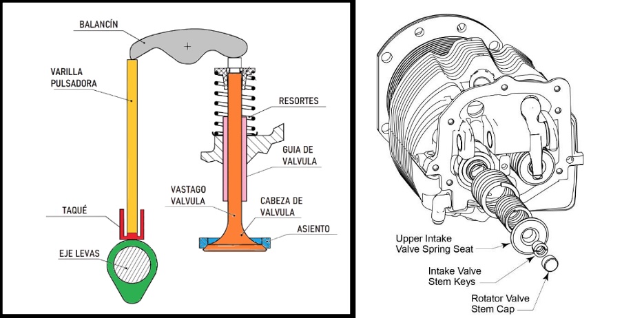 - Válvulas: Las válvulas son los elementos que abren y cierran los conductos de admisión y escape del cilindro, con lo cual cada cilindro tiene dos válvulas. Están hechas de cromo y níquel lo que las hace muy resistentes a grandes temperaturas.